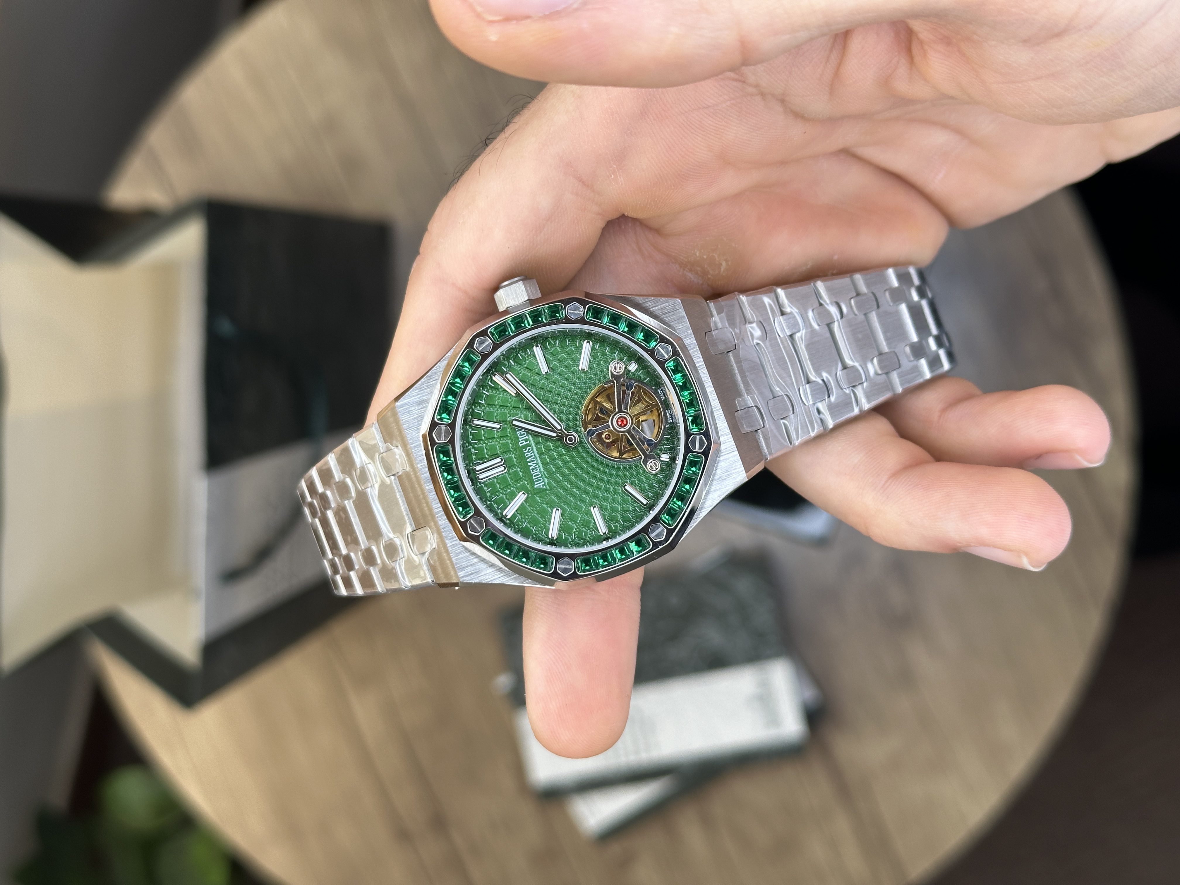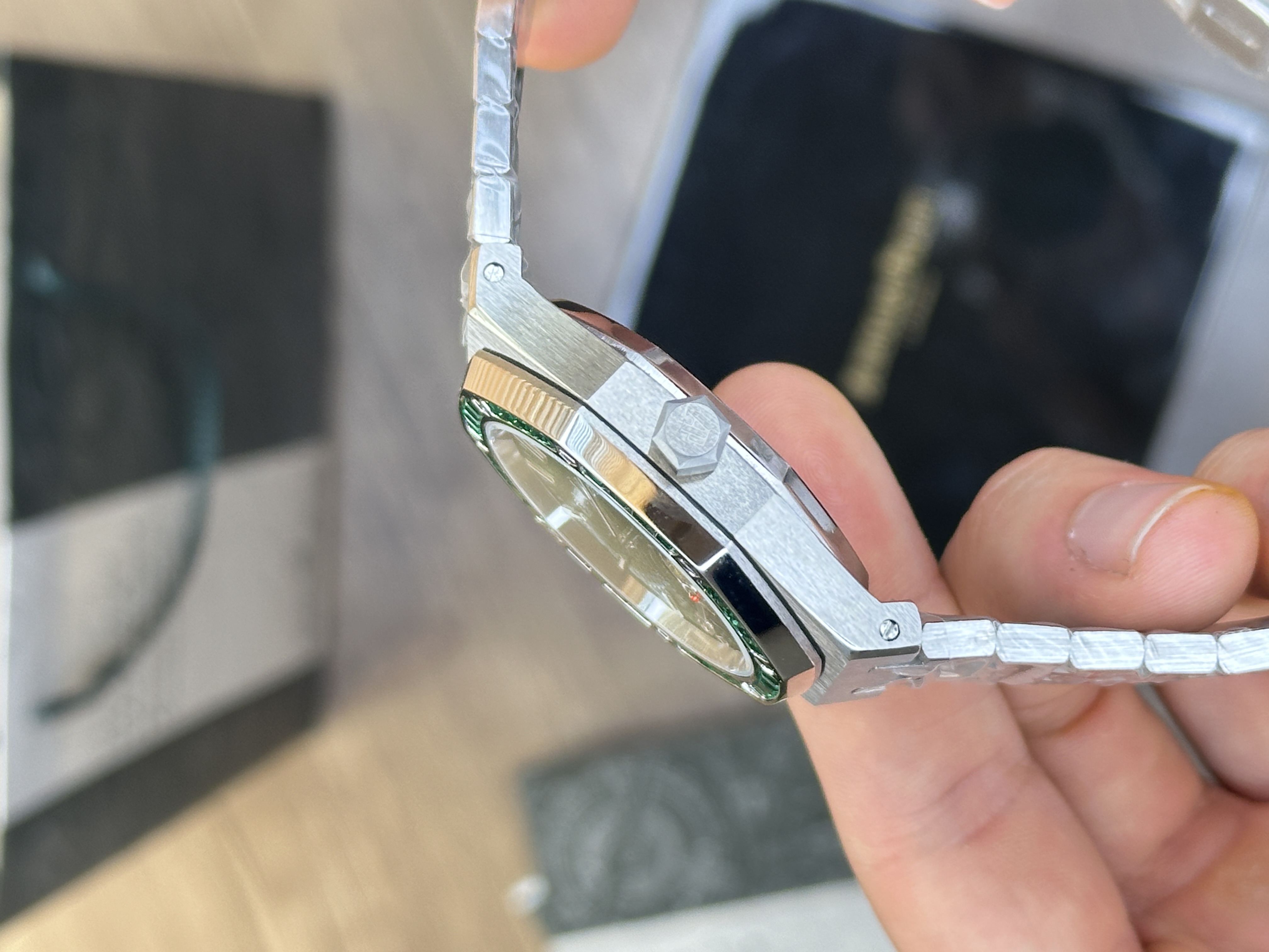 این مدل با رنگ فوق العاده زیبا و ترکیبش با نگین های سبز رنگ و صفحه اوپن هارت بسیار زیبا شده و در کنار اون کیفیت بسیار عالی مثل بدنه کامل استیل ۳۱۶ ضد حساسیت و ضد زنگ و موتور اتوماتیک گلد مستر با کیفیت عالی اون رو تبدیل به یکی از بهترین انتخاب ها برای افراد خاص پسند کرده.